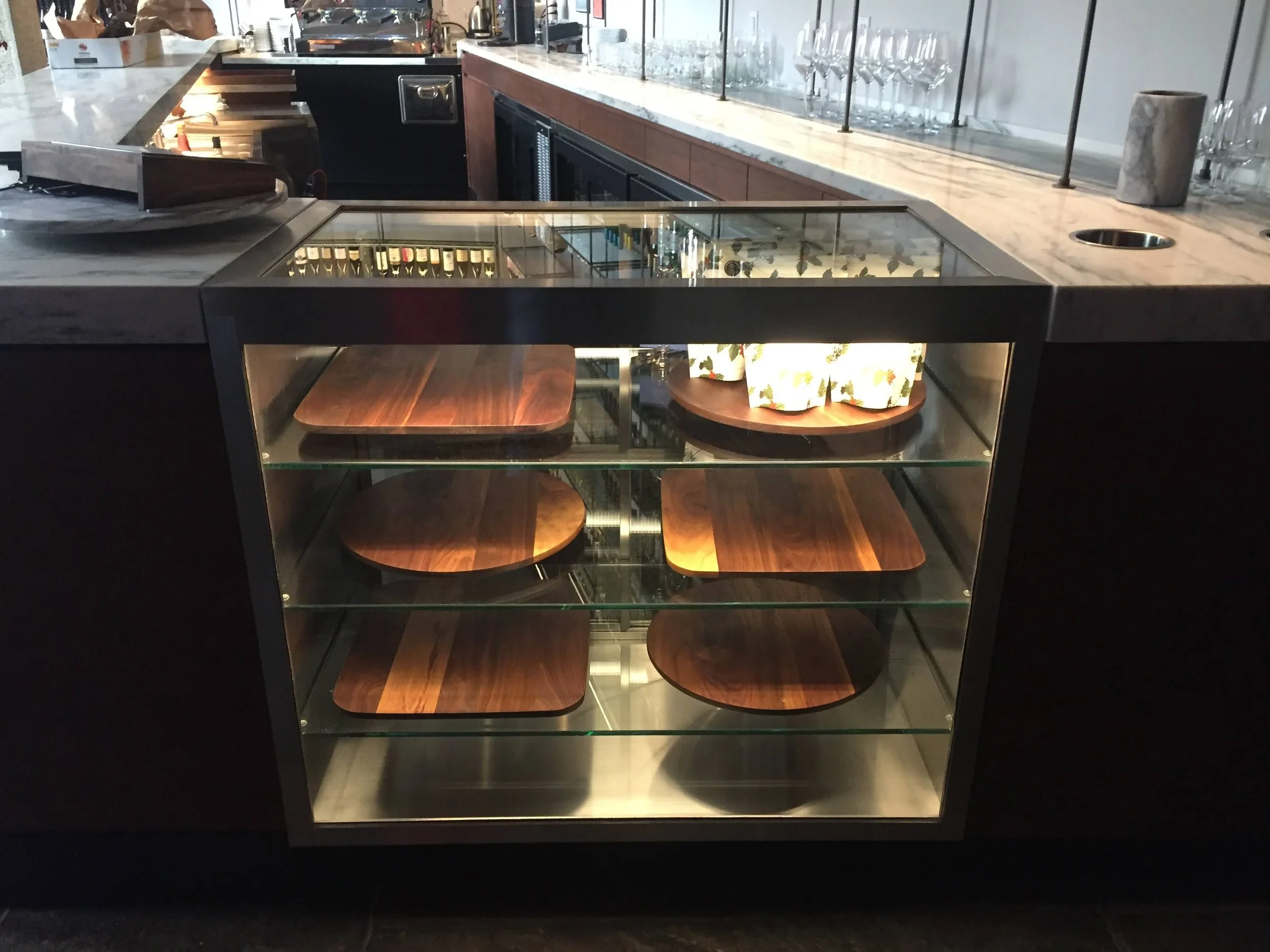 Design and fabrication, and installation of walnut point of sale and pastry display platters.