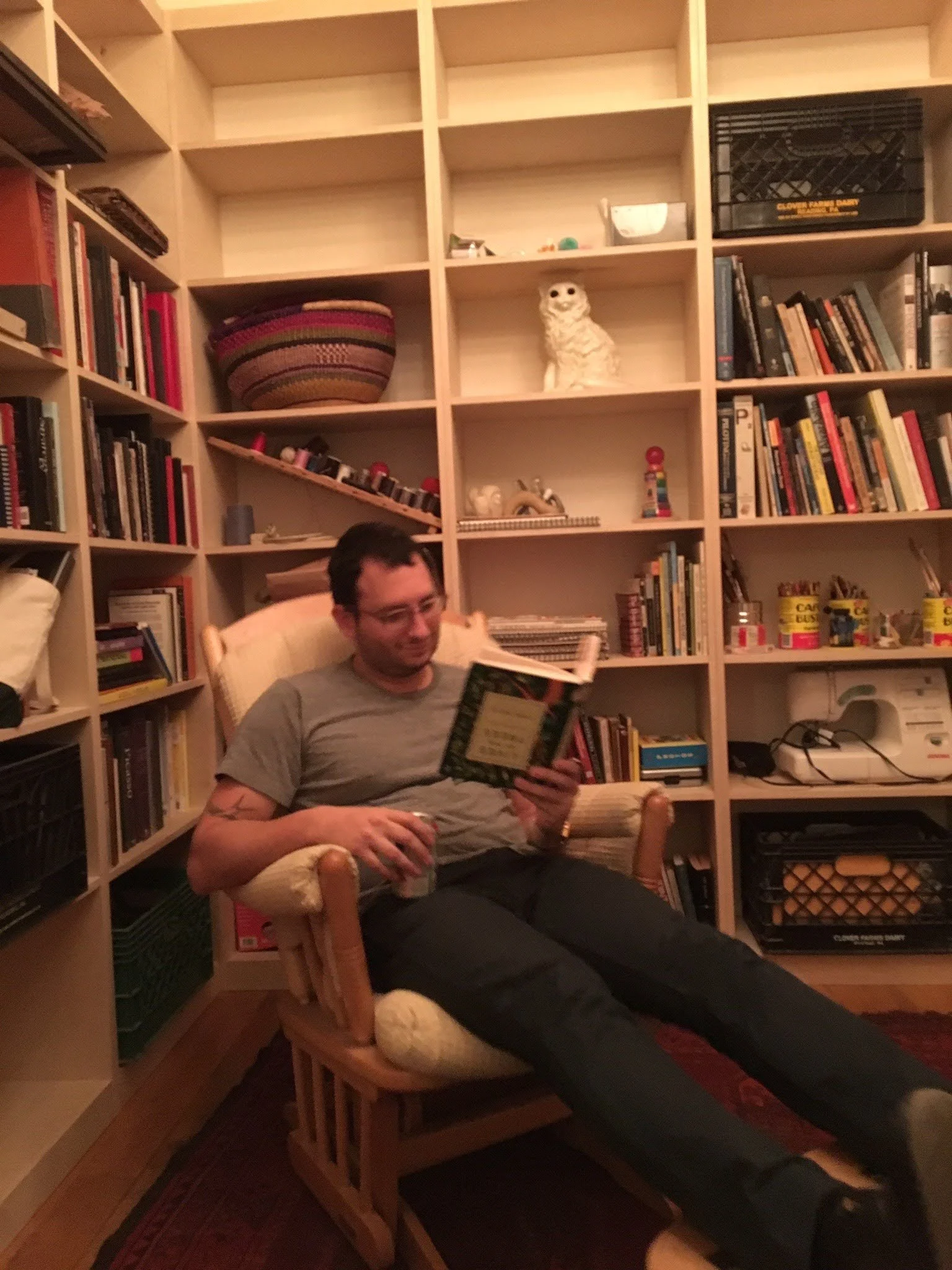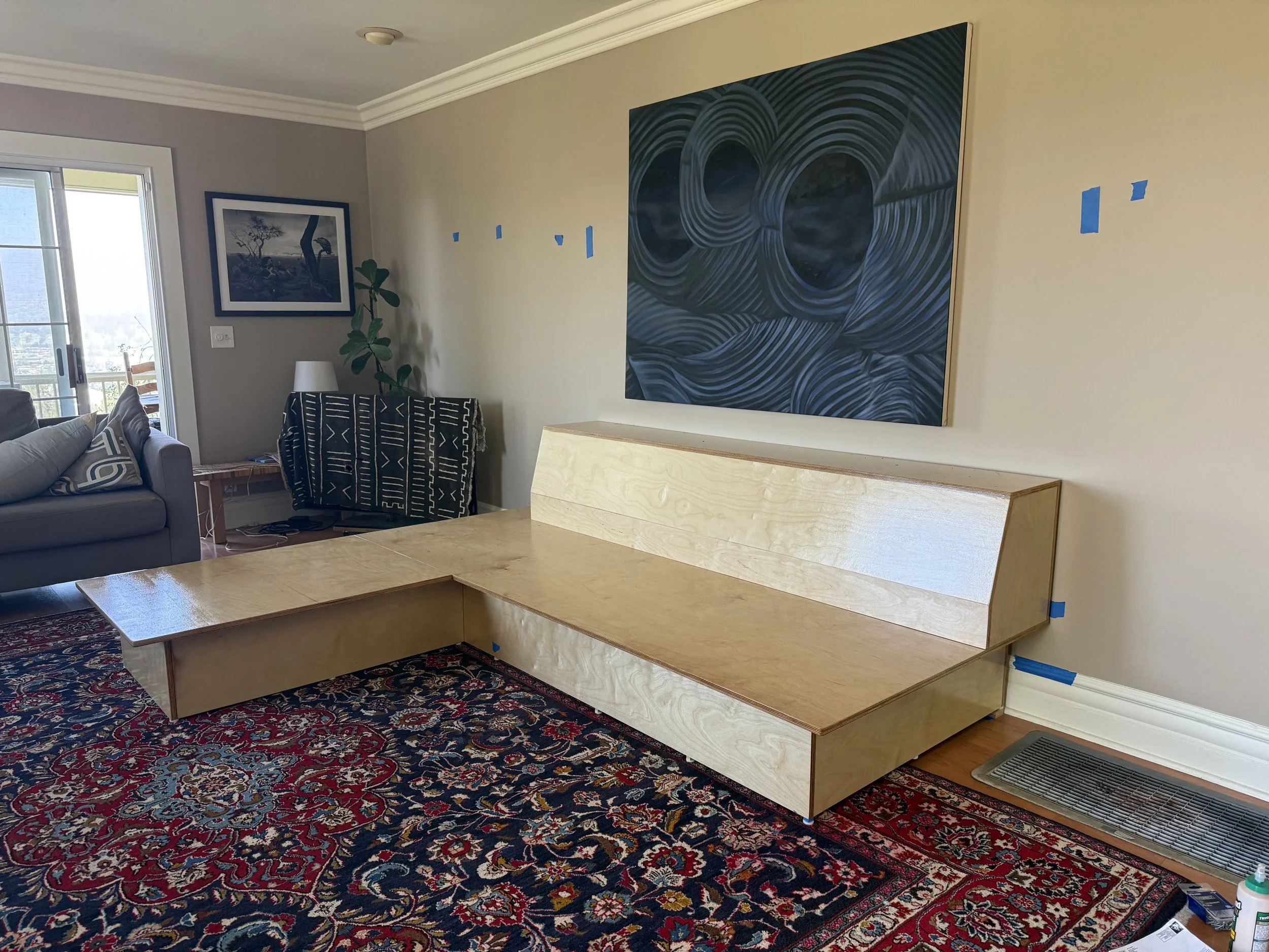 Design, fabrication, and installation of baltic birch couch and book shelves.