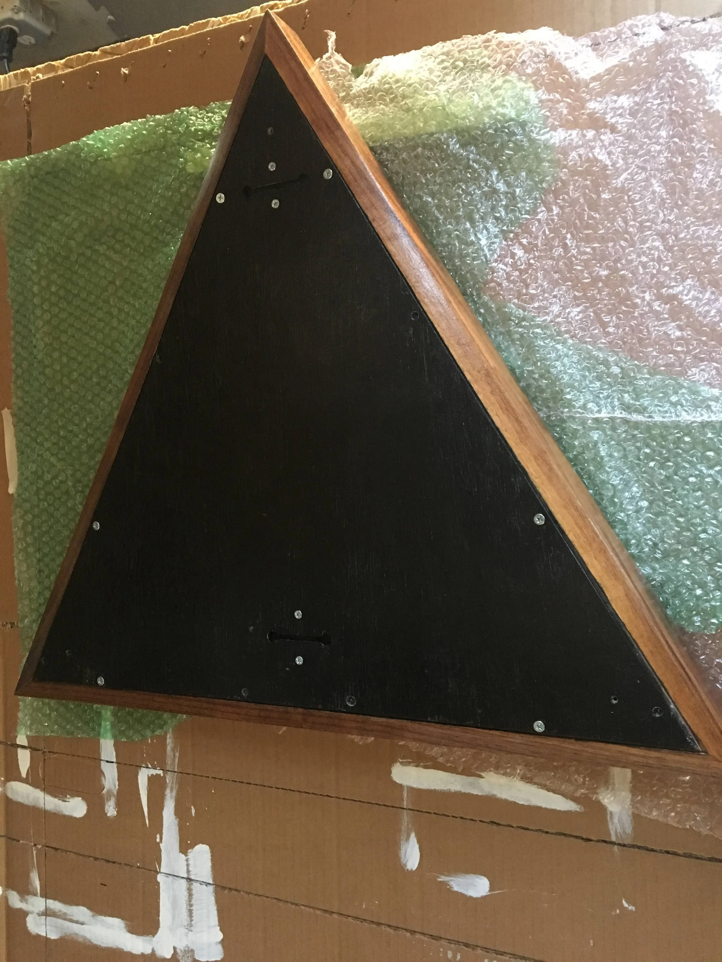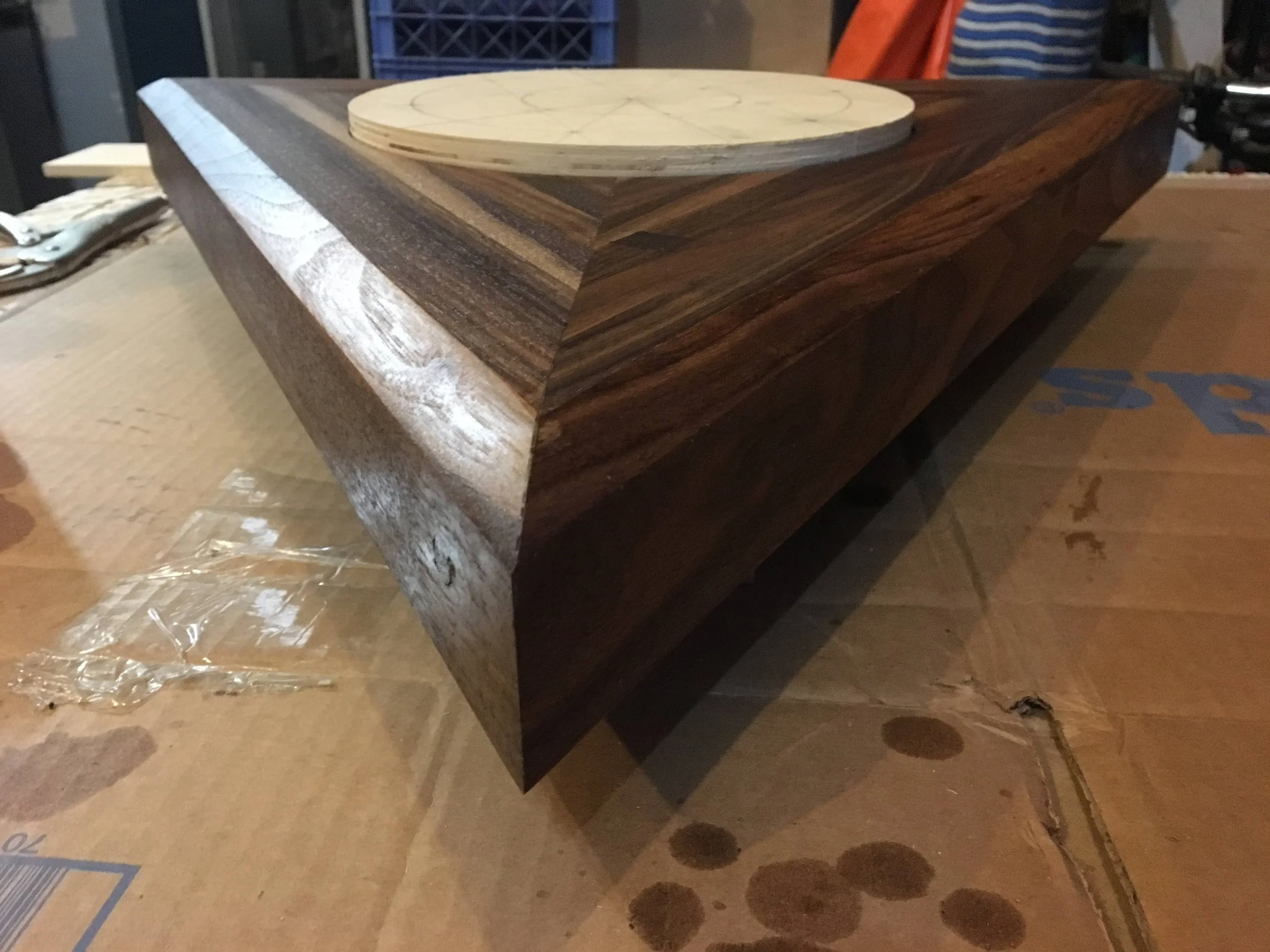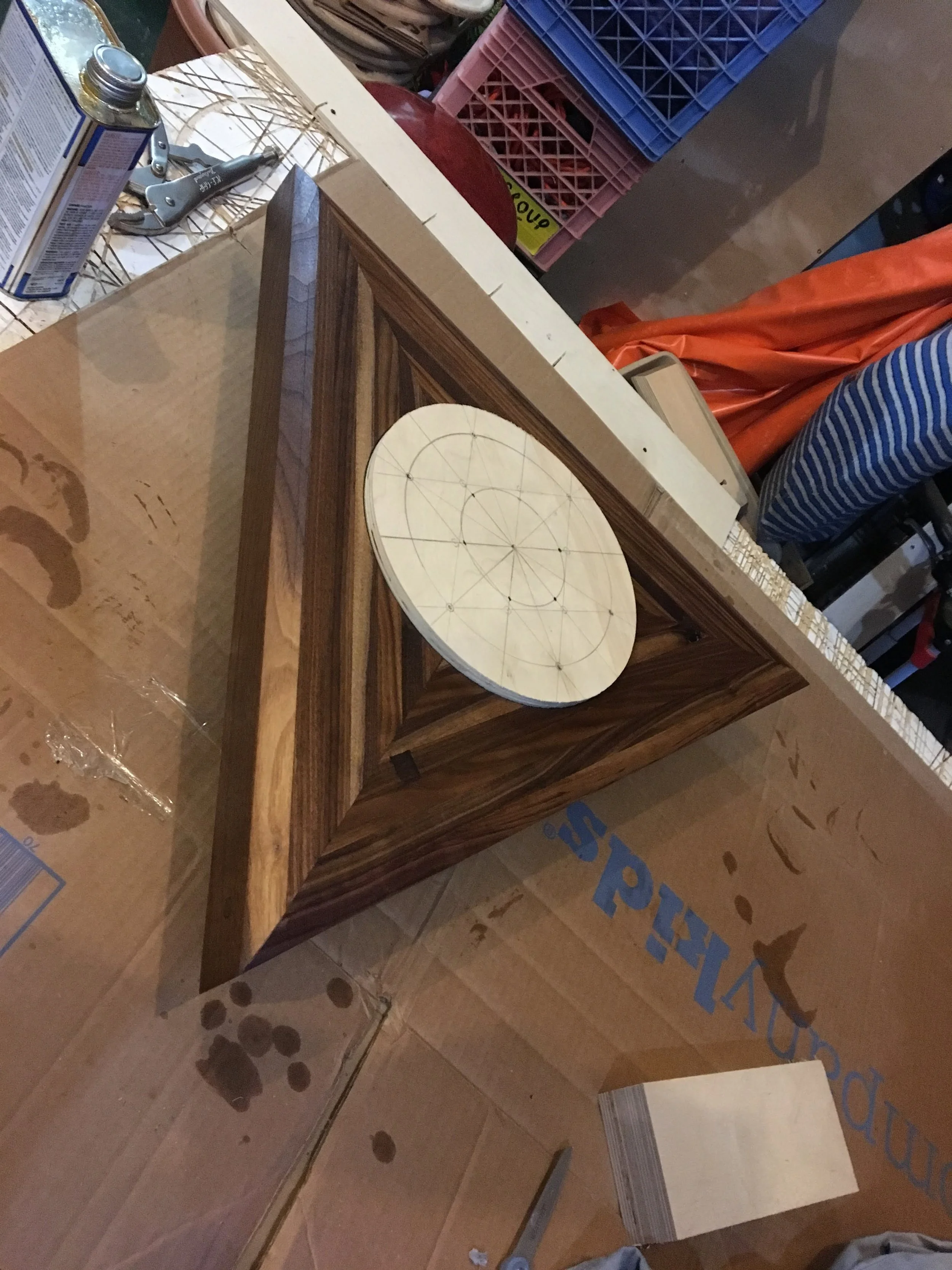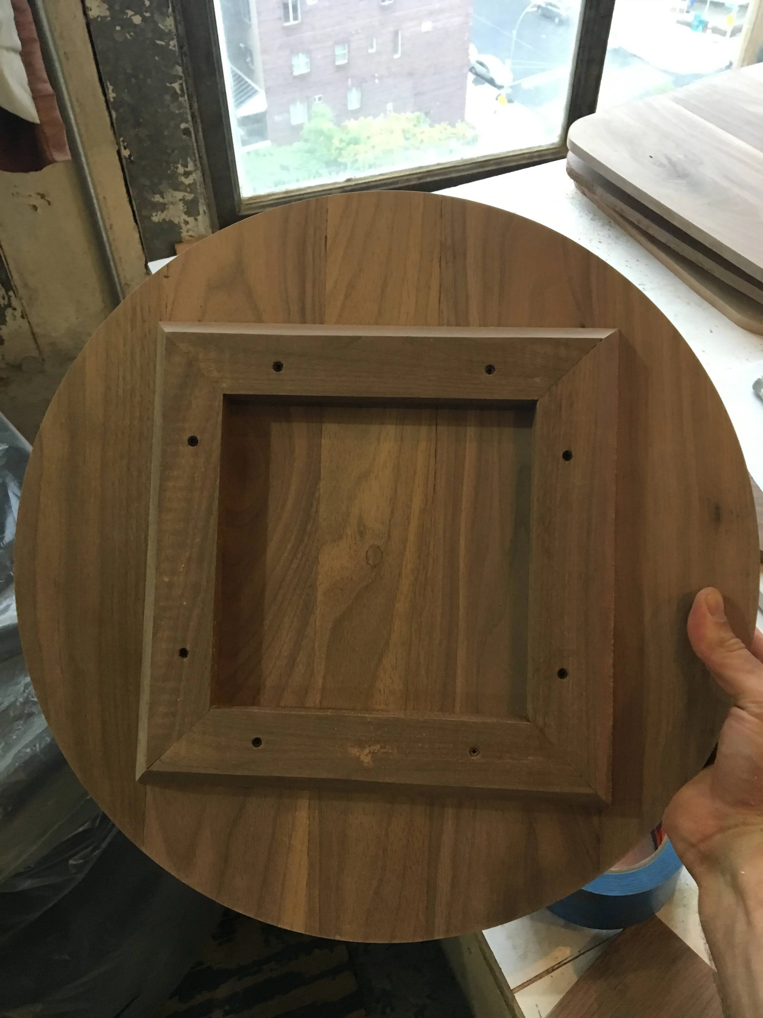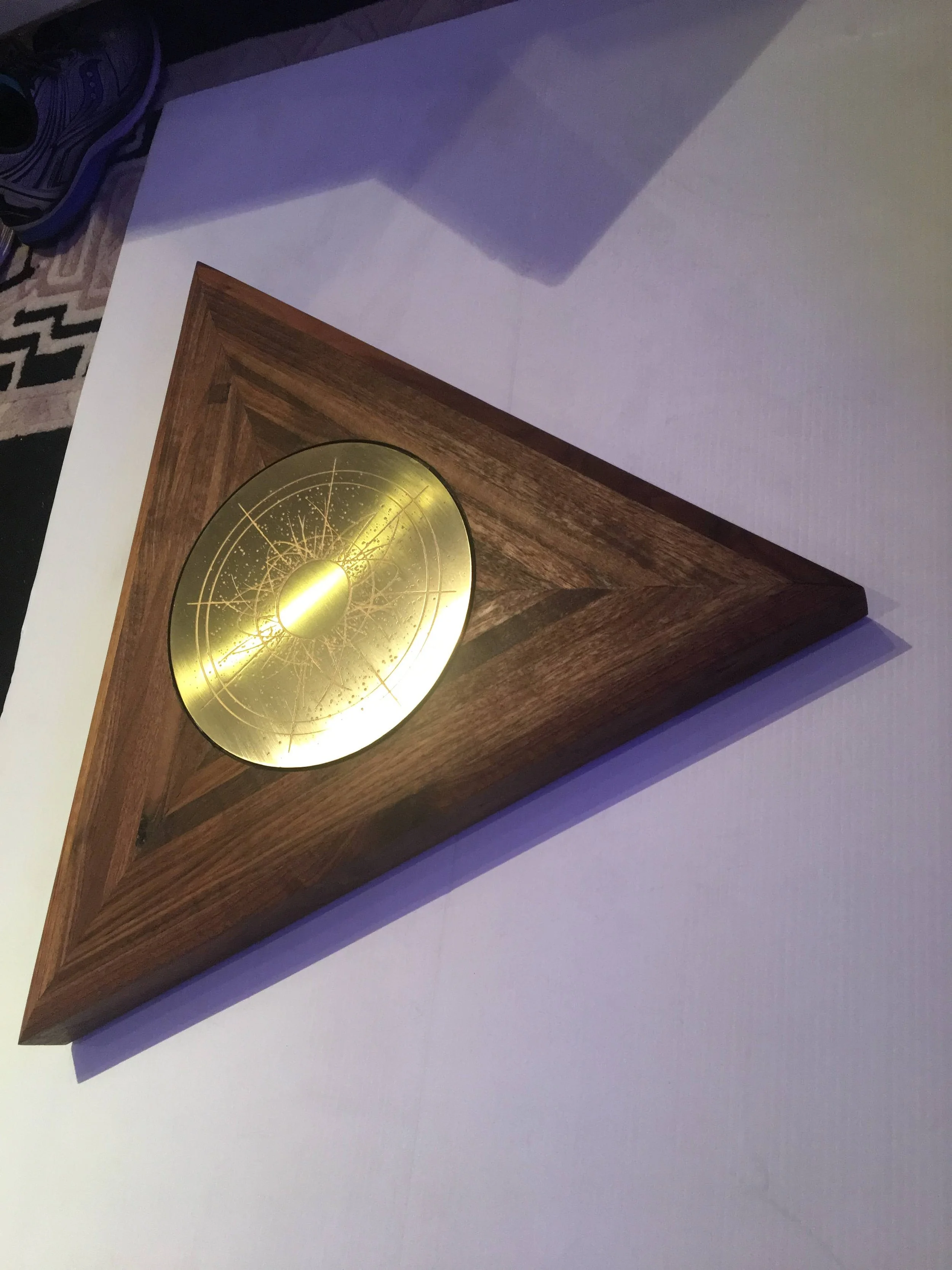 Design, fabrication, and installation of walnut urn with brass circle inlay.