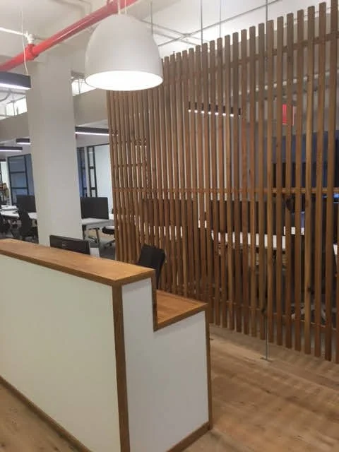 Design, fabrication, and installation of melamine & white oak reception desk and white oak screen.