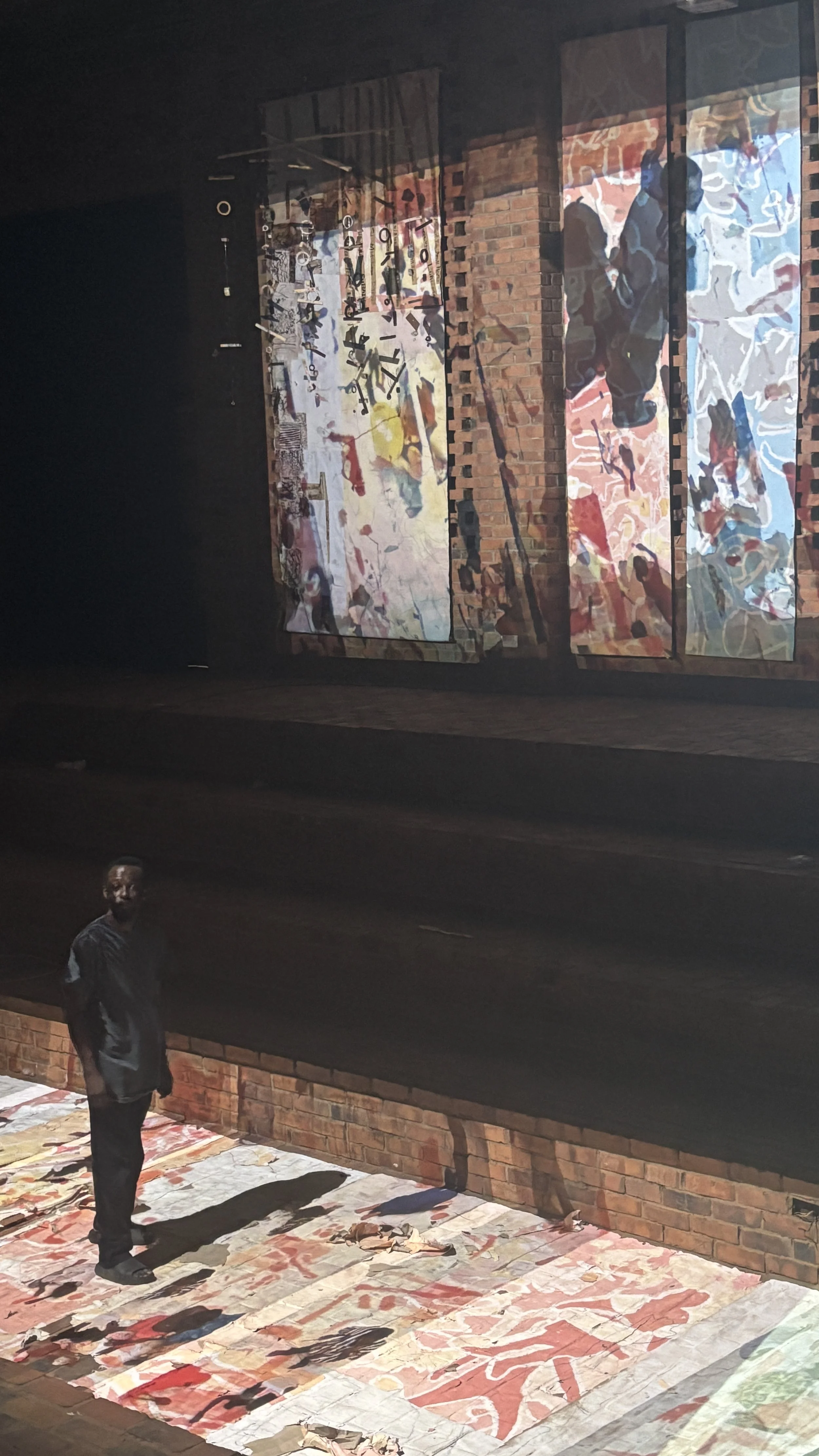 Participants entering the space encountered completed paintings from previous days hanging on brick walls. As they began to paint, cameras captured their movements and immediately projected them onto those same walls—live gestures overlaid on accumulated past work. Past, present, and projected-present coexisted simultaneously.