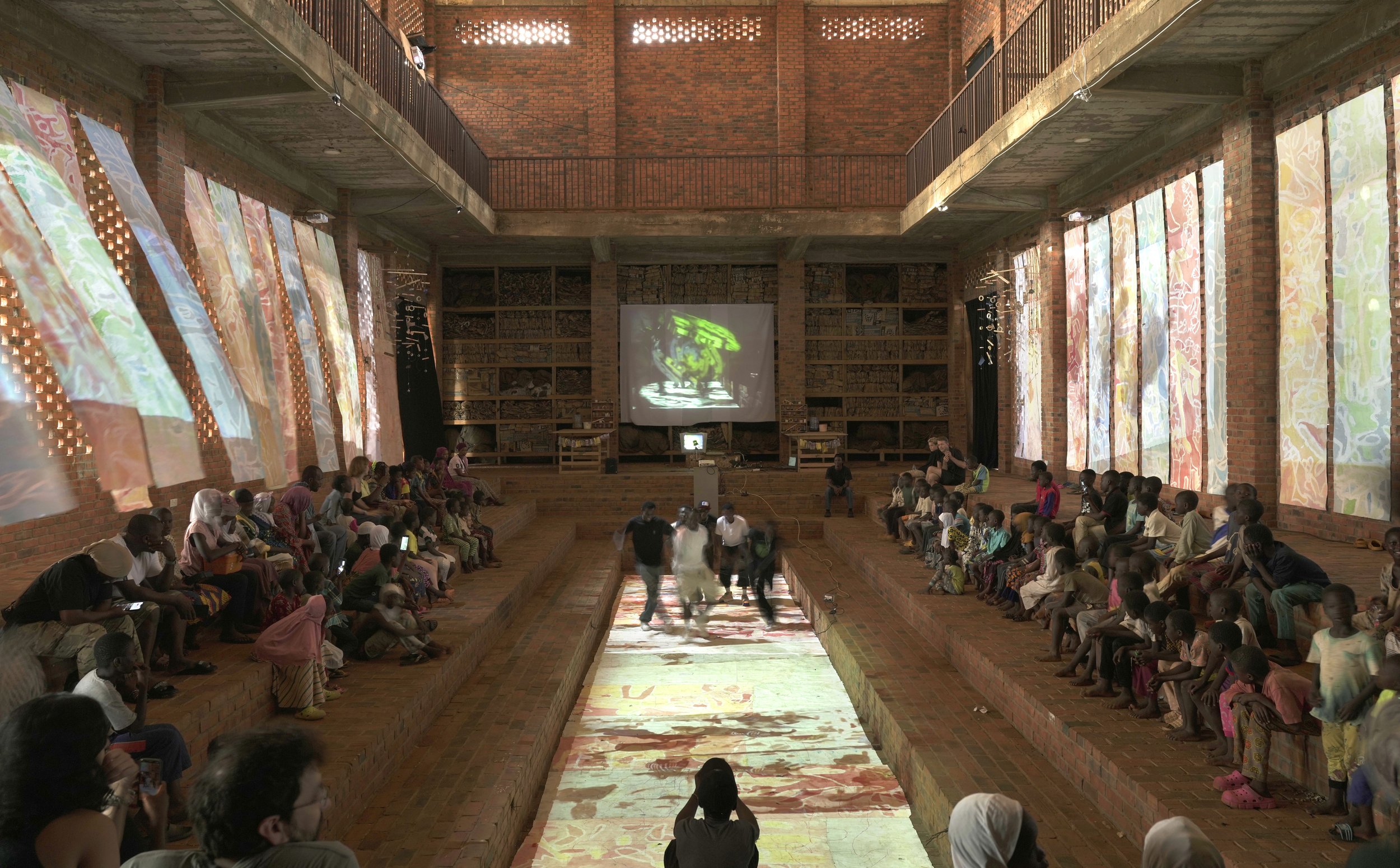 Old and new technologies collide throughout—CCTV cameras repurposed for connection, modern projectors throwing light through spaces designed around the sun's natural projection through Mahama's geometric brick cutouts, 4-point surround soundscape layering voices so present utterances mixed with echoes of past visits.