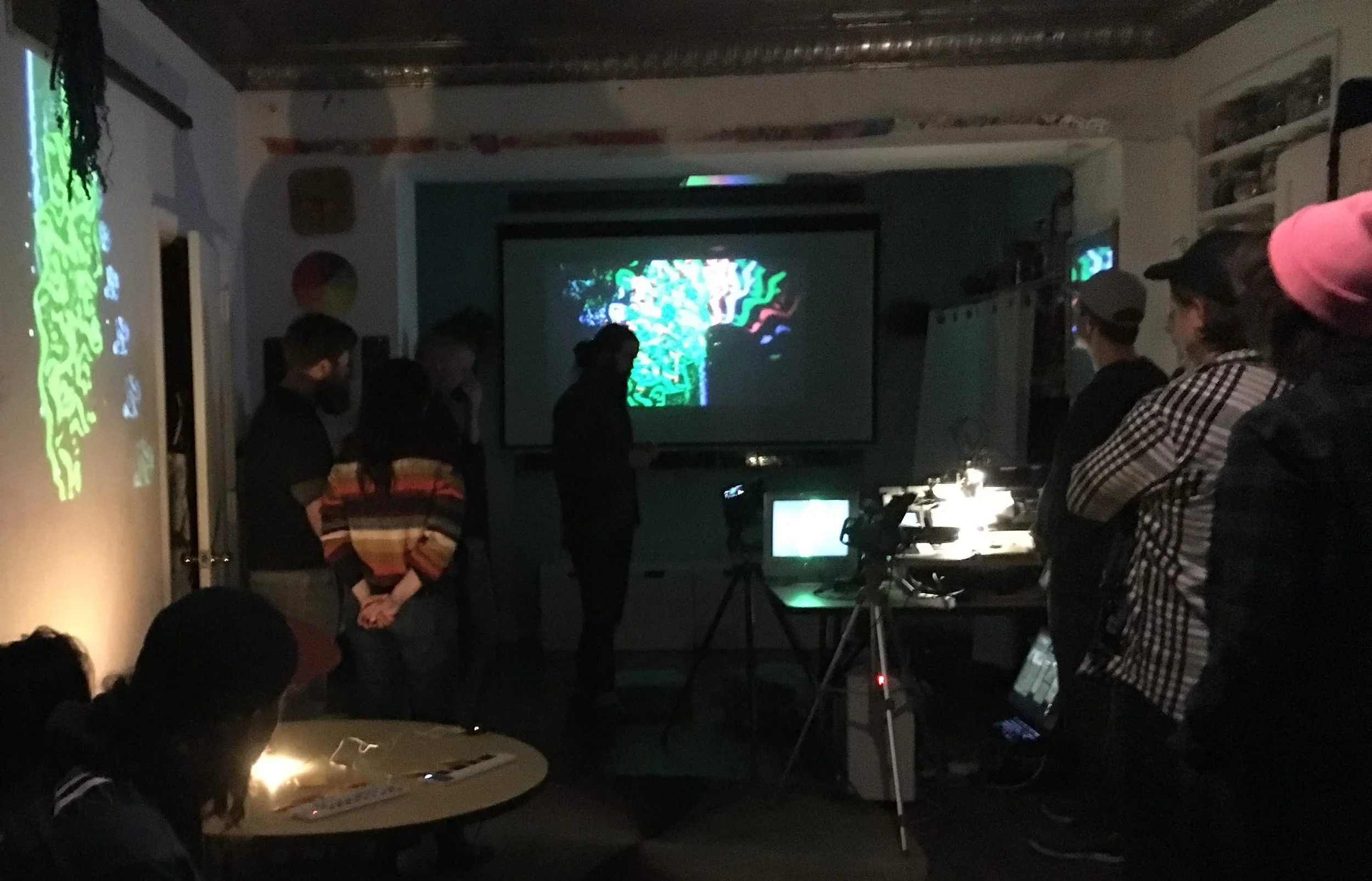 Workshops with adult participants of various ages including older adults, demonstrating video feedback techniques where participants create abstract visuals through hand movements and light manipulation.